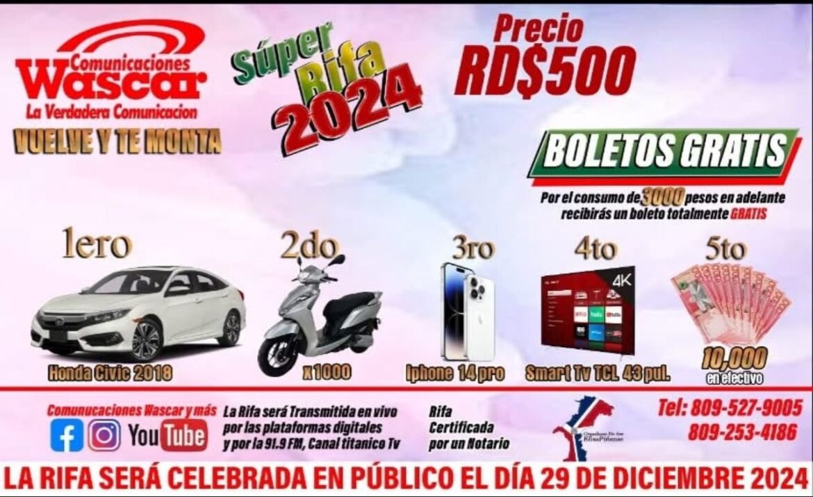 Comunicaciones Wasacar realizará gran rifa este domingo 29 de diciembre en Comendador, Elías Piña