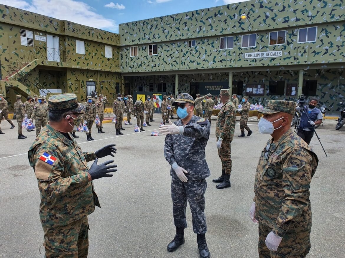 El comandante general del Ejército de República Dominicana, Mayor General Estanislao Gonell Regalado recorrió este domingo la frontera del país y entregó a los militares algunos insumos, entre ellos, mascarillas, guantes y raciones alimenticias.
