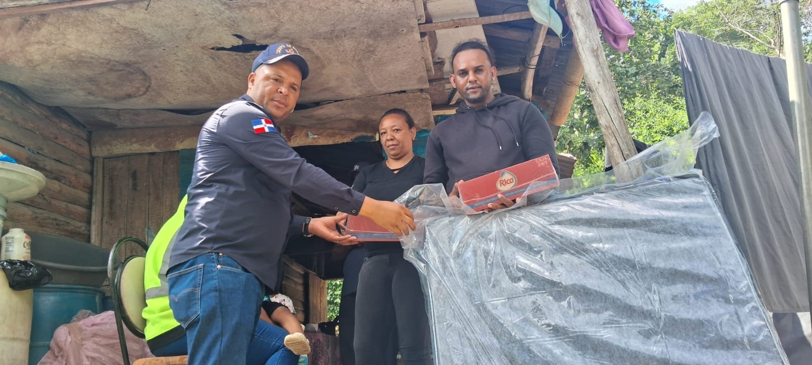 Durante la jornada fueron entregadas 150 cajas de leche Listamilk, equivalentes a 4,050 unidades, así como 150 cajas de jugos variados (3,600 unidades) y 25 colchones, con el objetivo de aliviar las necesidades más urgentes de las familias que perdieron parte de sus pertenencias.